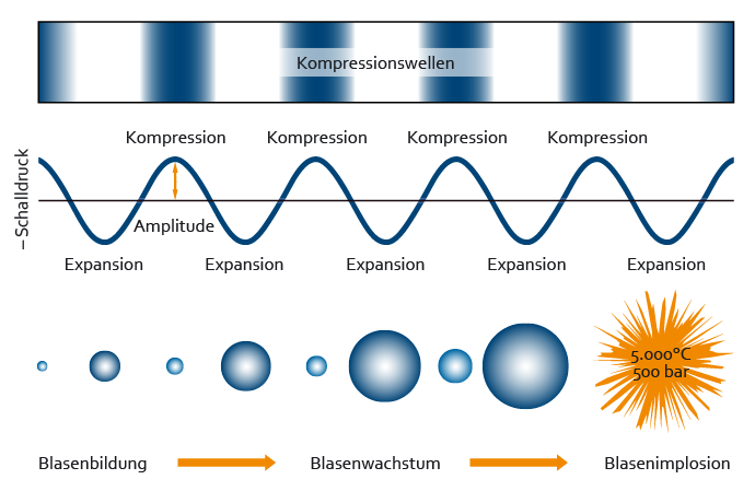 Im Frequenzbereich von 20 bis 100 kHz werden besonders große Kavitationsblasen erzeugt,